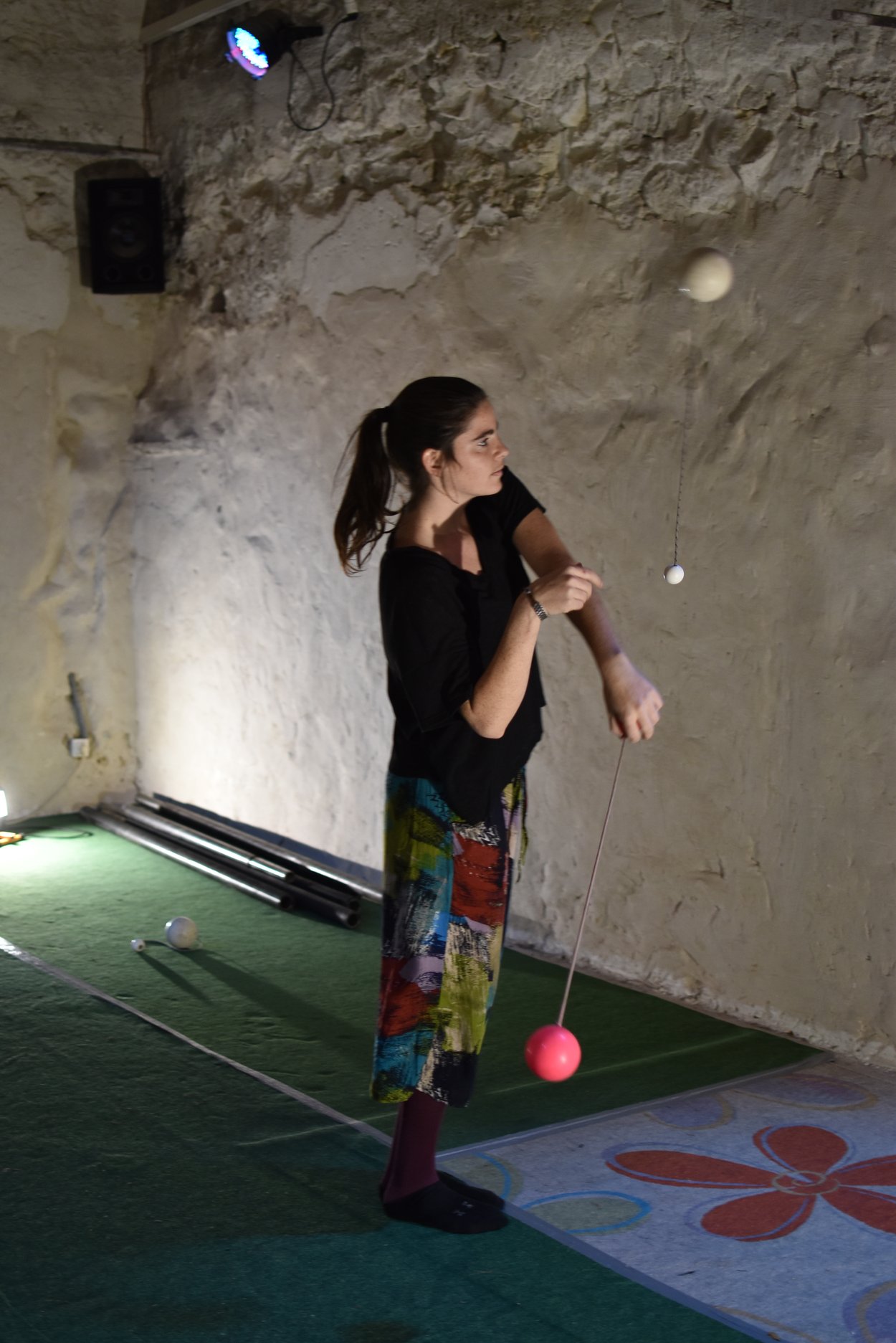 C’est gracieux, c’est fluide mais très technique. Les Poïs (bolas) donnent l’impression d’avoir leur vie propre endiablés par la musique mais c’est bien la jongleuse, Eva qui les commande, qui les dresse. Cet agrès encore plus impressionnant quand les bolas sont enflammées enrichie les conventions de jonglerie en y apportant une palette de figures encore plus larges.