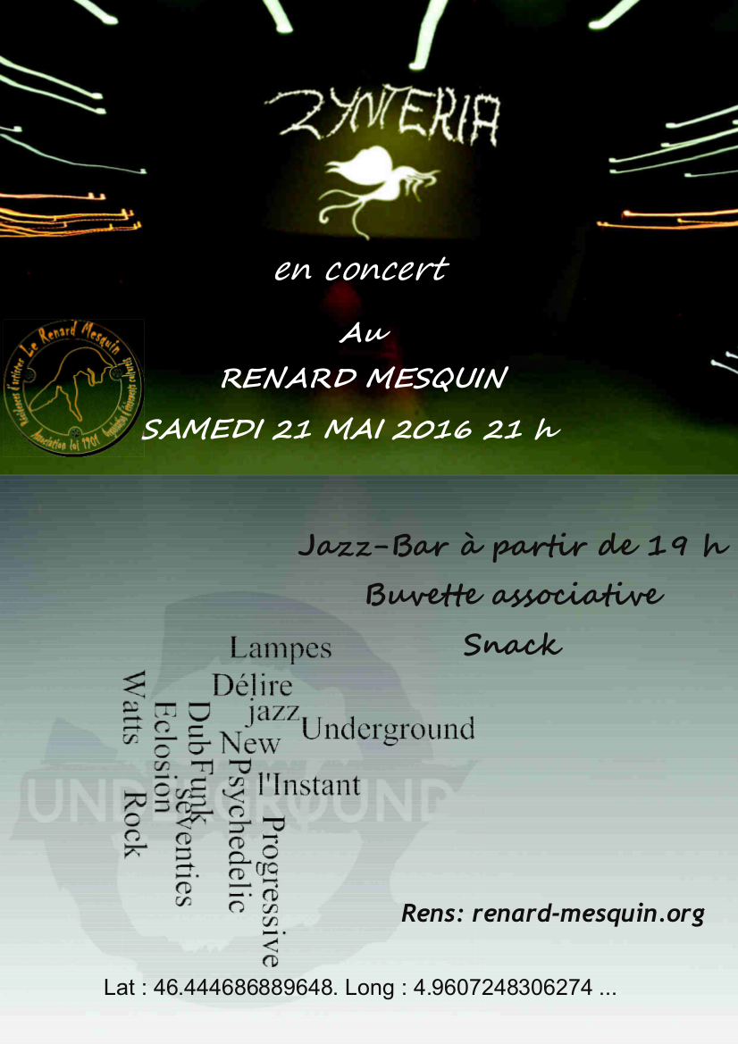 Retenez dès aujourd’hui votre soirée pour venir écouter ZYNTERIA samedi 21 mai au Renard Mesquin Plus qu’un simple concert c’est une soirée ambiance « underground » que Wil et Ber et leurs amis vous proposent de partager en toute simplicité. Dès 19 h Jazz bar dans les vignes avec possibilité de restauration associative (planches fromage, charcuterie…