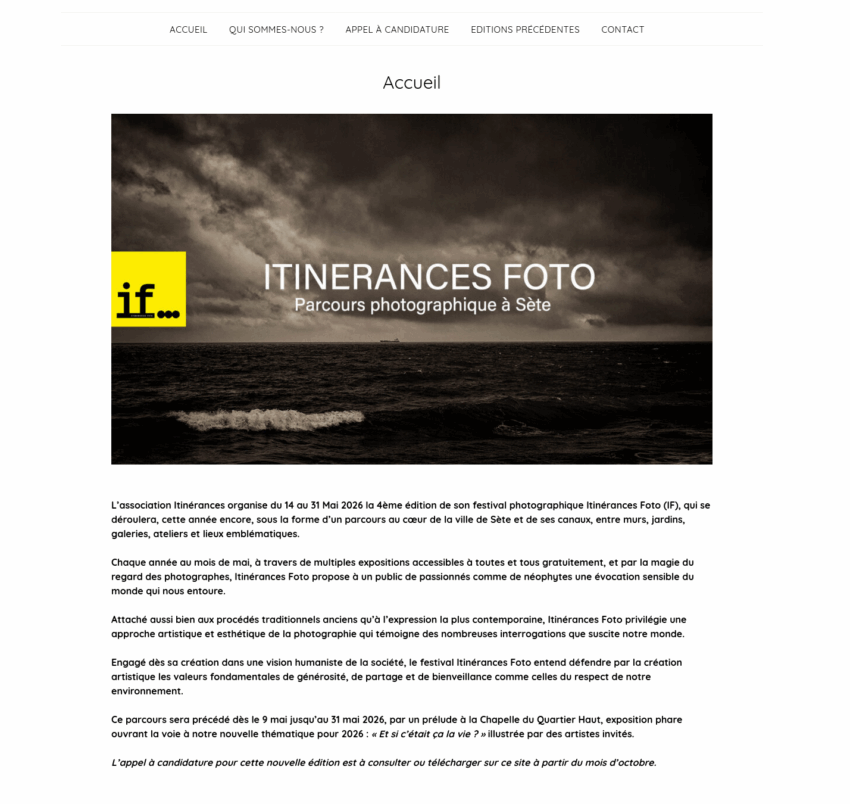 Un bon coup de main à l’association Itinérances-FOTO de Sète pour mettre en ligne un site internet sous WordPress . N’hésitez pas à visiter leur site. Il se prépare un bel évènement en 2026. https://itinerances-foto.com/